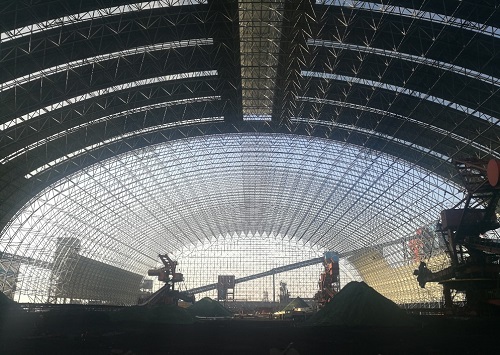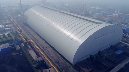 山西焦化煤场全封闭项目钢结构工程位于洪洞县明姜镇的山西焦化二厂厂区内,包括土建及钢结构部分,属EPC工程总承包项目。钢结构网壳分东、西两部分施工,采用螺栓球节点三心圆柱壳体结构,跨度130 m,高度达53 m,用钢量3200余吨,施工采用山墙起步、高空扩拼的方法,是当时山西省内高度******、跨度******的全封闭煤棚工程。
