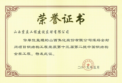2019年5月30日, 全国建筑钢结构行业大会在湖南长沙隆重举行。由我公司监理的山西焦化股份有限公司煤场全封闭项目钢结构工程,在本次大会上喜获“第十三届第二批中国钢结构金奖工程”。